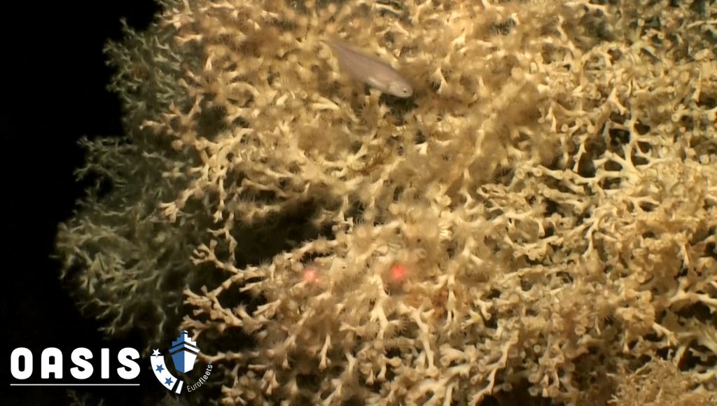 Busy days with the ROV “Max Rover” provided by the Greek HCMR yielded plenty of discoveries and unique findings. OASIS scientists found unexpected large reefs of Lophelia pertusa, spotted in thriving conditions for the first time on the uppermost part of some mounds in the Catifas Bank.